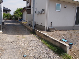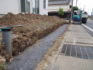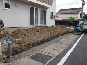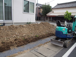 土を掘って、砕石を敷いて、塀の基礎を造る下準備中。