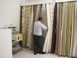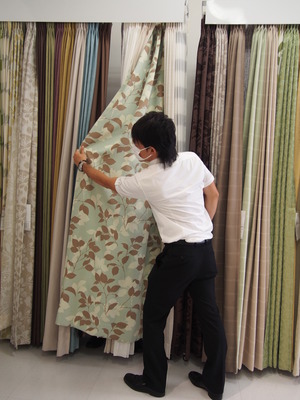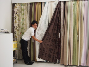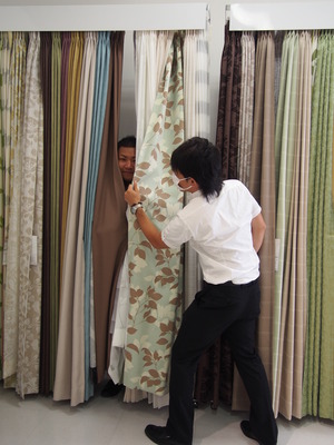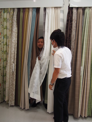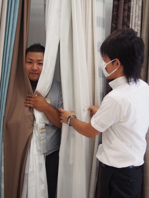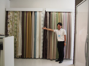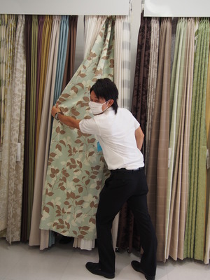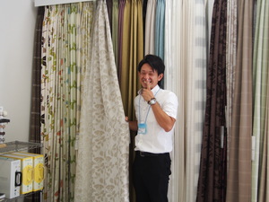 マスクを外したボスが、カーテンをご紹介!
