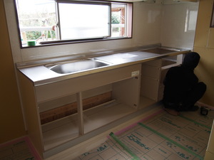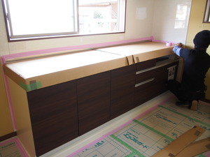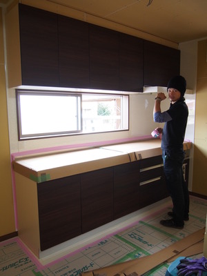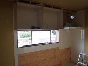 まずは、吊り戸棚とレンジフードを付けまーす。