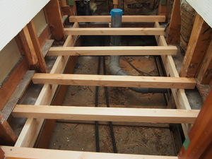 こんな感じに、根太を留めて、この上に合板を張って、フロアーを張ります。