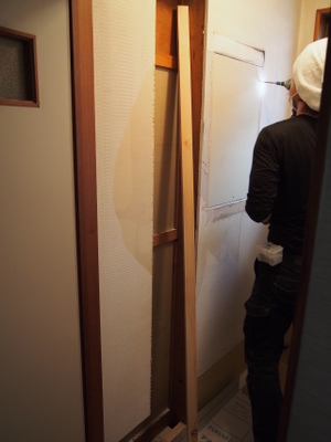 剥がした壁の所も、ボードを張り、ボスの木工事完了~。