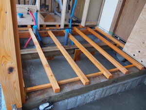 床を造っていきます。白アリ防腐剤を塗った材木を使います。