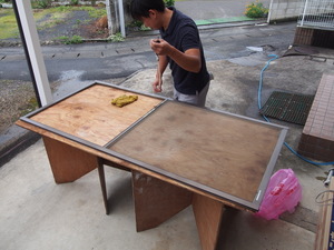 得意の網戸の張替中~~♪何枚も張り替えます~~♪