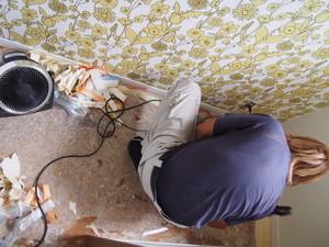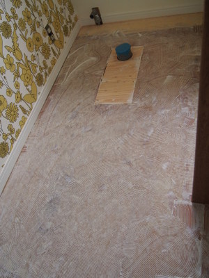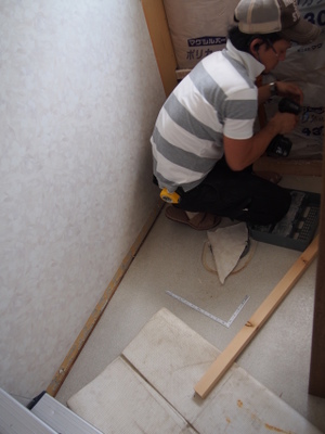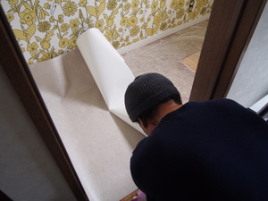 排水が終わったので、床にクッションフロアー貼ってます。