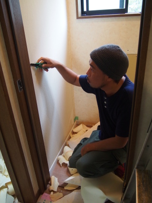 貼ってあったクロスを剥がしてます。集中しすぎて、口が半開きです。