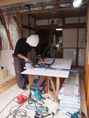 オダカクン、ケイカル板切ってます。