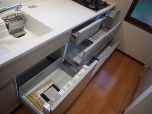 キッチン収納は、全部引出式。キッチン用品って、