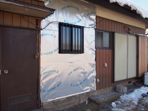 床の造作をしながら、シートを敷いて生コン車待ち。