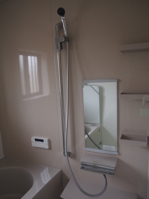 落ち着いた色のお風呂をチョイス!壁と浴槽が同じ色♪
