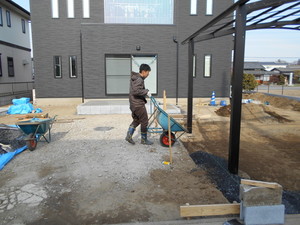 砕石の山から、スコップで一輪車に砕石を入れ。