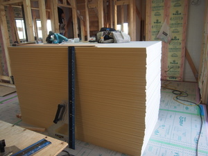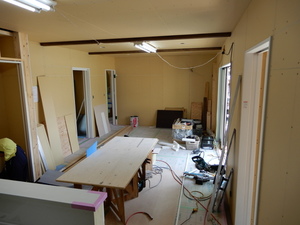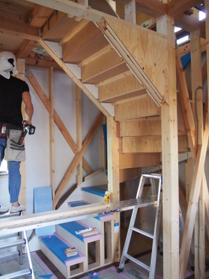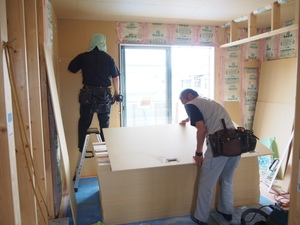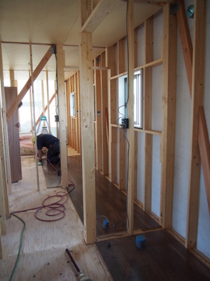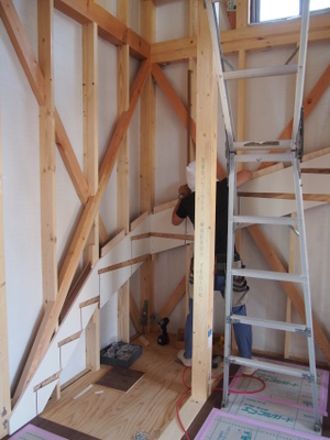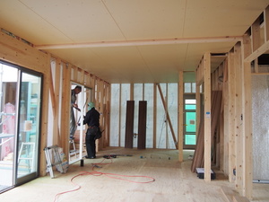 一階もほぼ張り終わり、建具の枠も取付けられました。