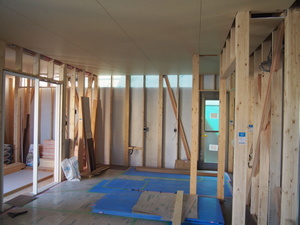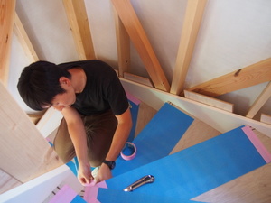 フロアー張れたら、壁ぐるっと断熱材敷きつめます。