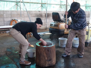 もち米を臼に運びます。蒸し布が熱いので、一瞬で運びます!