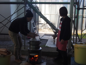 火を焚いて、もち米を蒸かしてまーす。