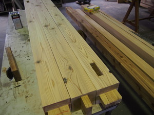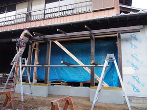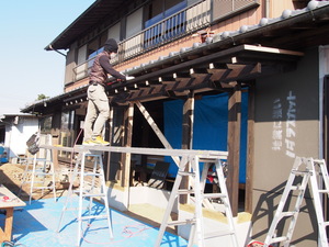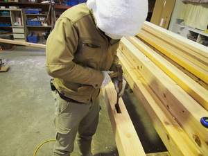 柱が立ったらその上に桁をのせて、
