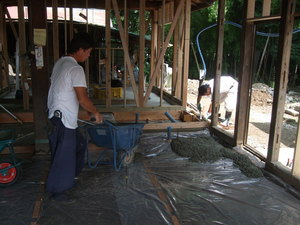 コンクリートを一輪車で運びます