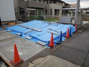 ブルーシートにて保護します
